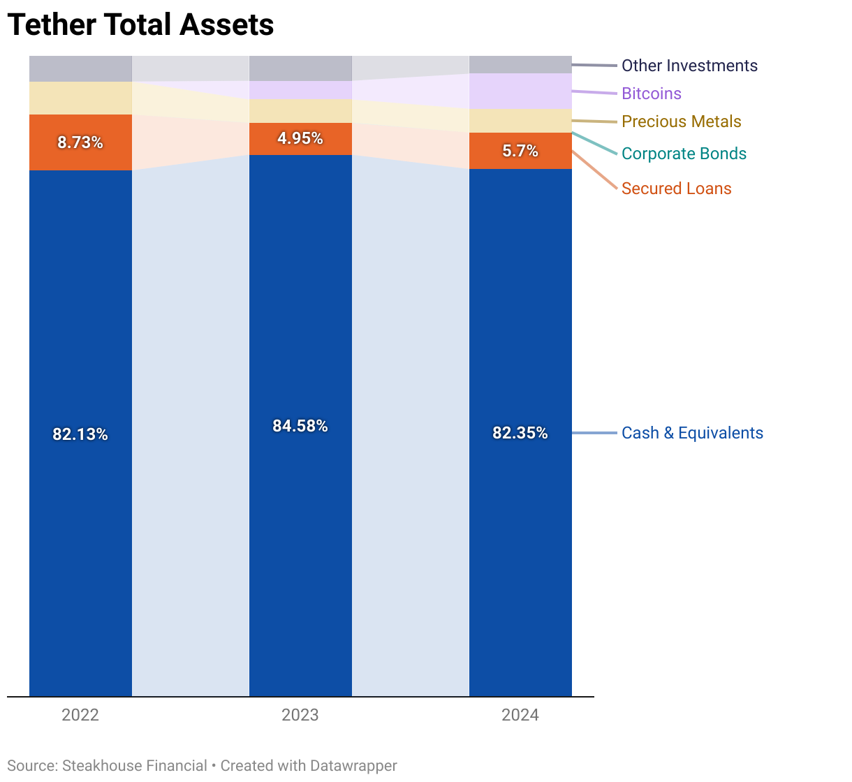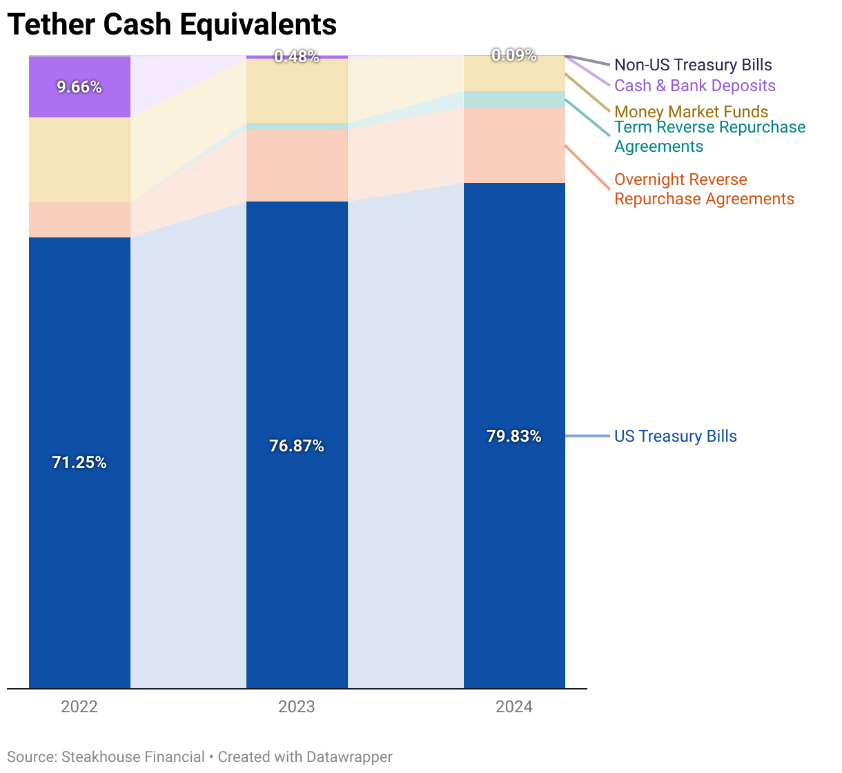 Another issue lies with "cash equivalents." These are not the same as cash—even Treasury bonds, considered safe-haven assets, can fluctuate in value. This becomes even riskier with stocks and cryptocurrencies like Bitcoin and Ethereum. The problem is that mainstream stablecoins' backing consists mainly of these "cash equivalents." In fact, no current stablecoin maintains a pure one-to-one USD peg. See below.