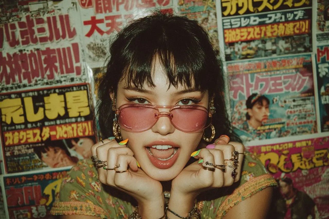 a cheerful girl with exaggerated colorful nails, vibrant rings, and pink translucent sunglasses, posing in front of a wall of Japanese magazines | 90s Japanese cyber fashion style | expressive hand pose with toothy smile | harsh fluorescent lighting | analog aesthetic, fashion editorial look --ar 3:2 --raw --stylize 400TEAHEE Moments