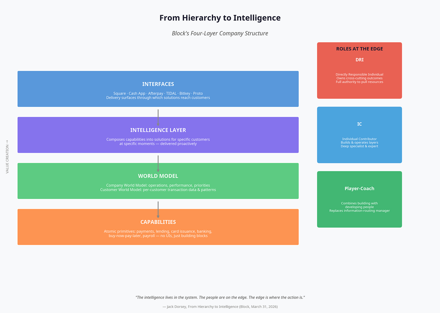 •Jack Dorsey, “From Hierarchy to Intelligence”, Block, March 31, 2026