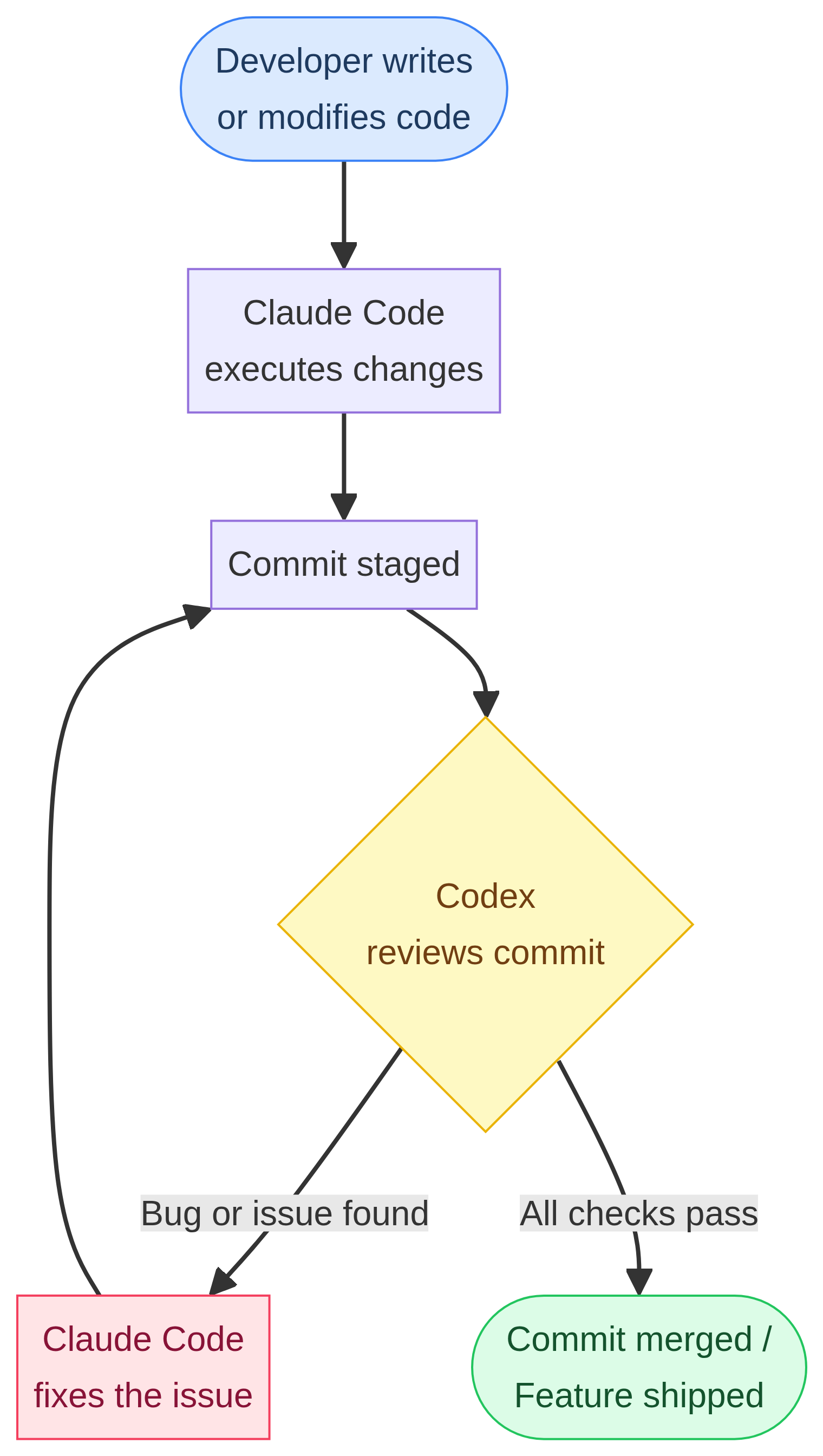 Diagram 2: The automated loop where Codex acts as a gatekeeper for every commit made by Claude Code.