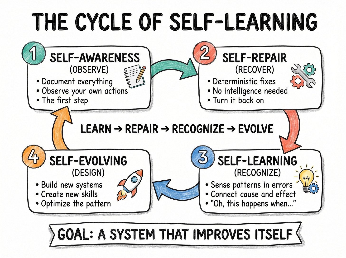 That is also how a self-evolving system works. Self-awareness creates the record. Self-repair handles the trivial. Self-learning surfaces the patterns inside the mistakes. Self-evolving redesigns around what the mistakes revealed. Errors are not exceptions to the system. They are the curriculum.