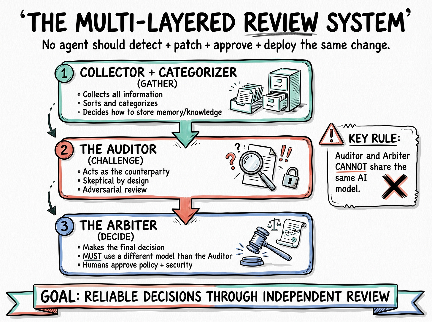 The second principle I keep returning to is that no critical system should run without independent review. One watchdog is not enough. You want a meta-watchdog watching the watchdog, and any high-stakes decision needs a second pair of eyes.